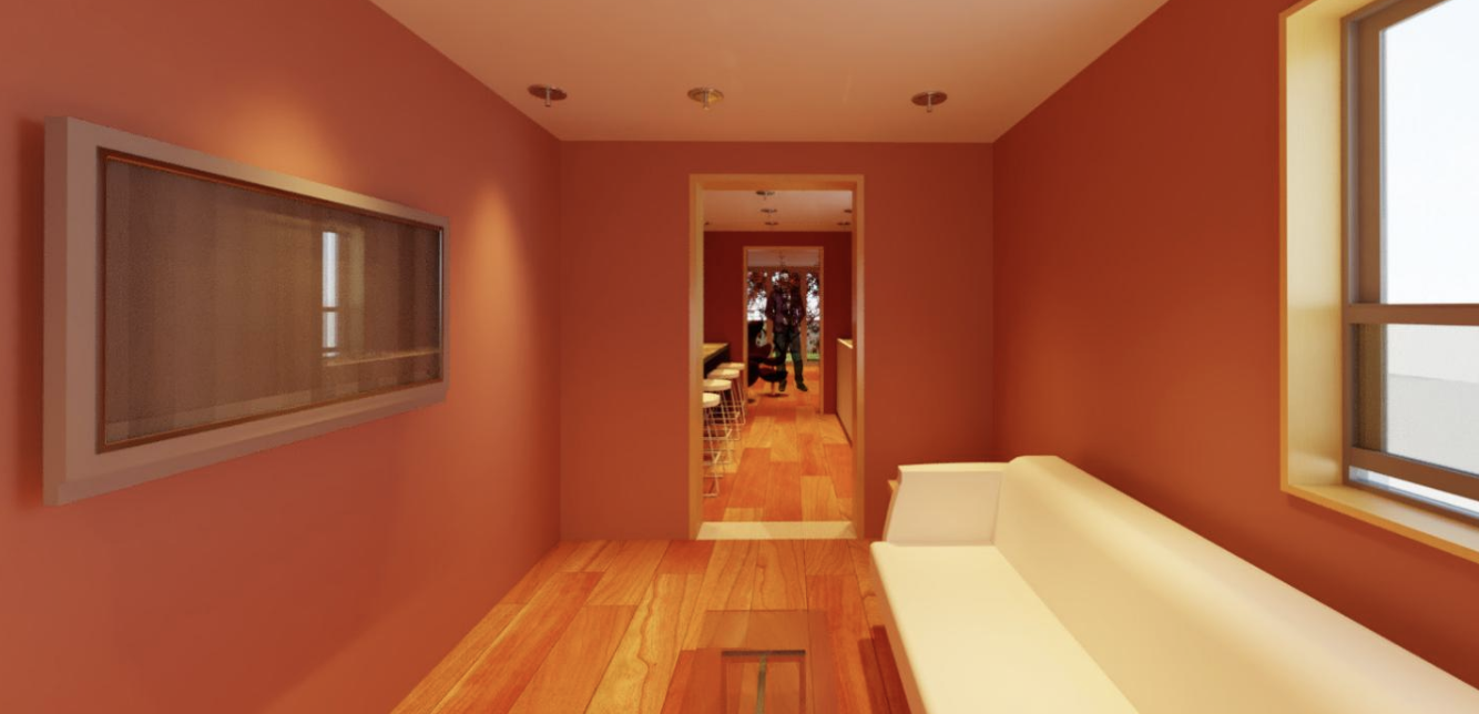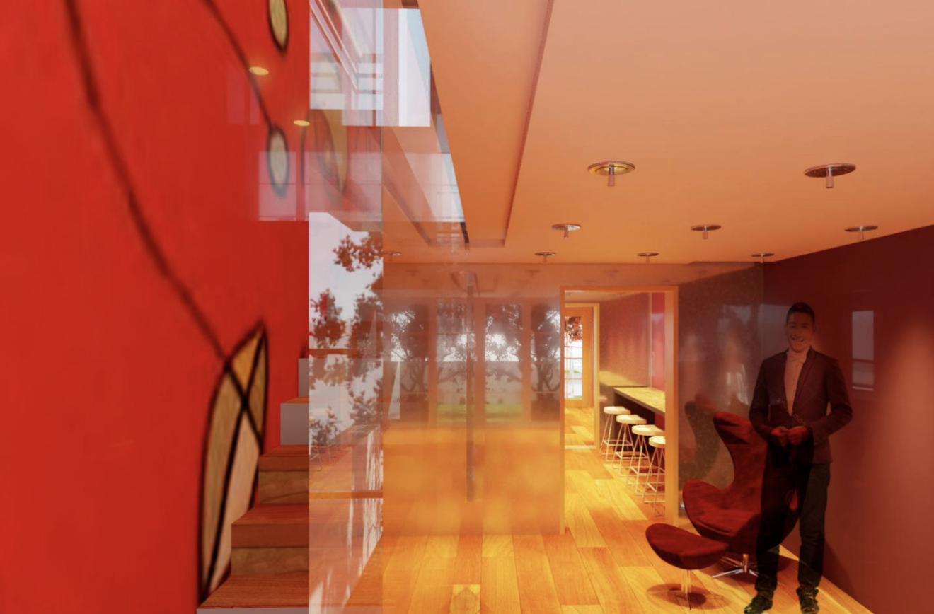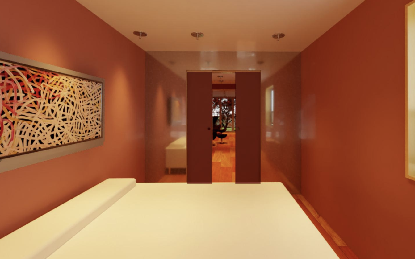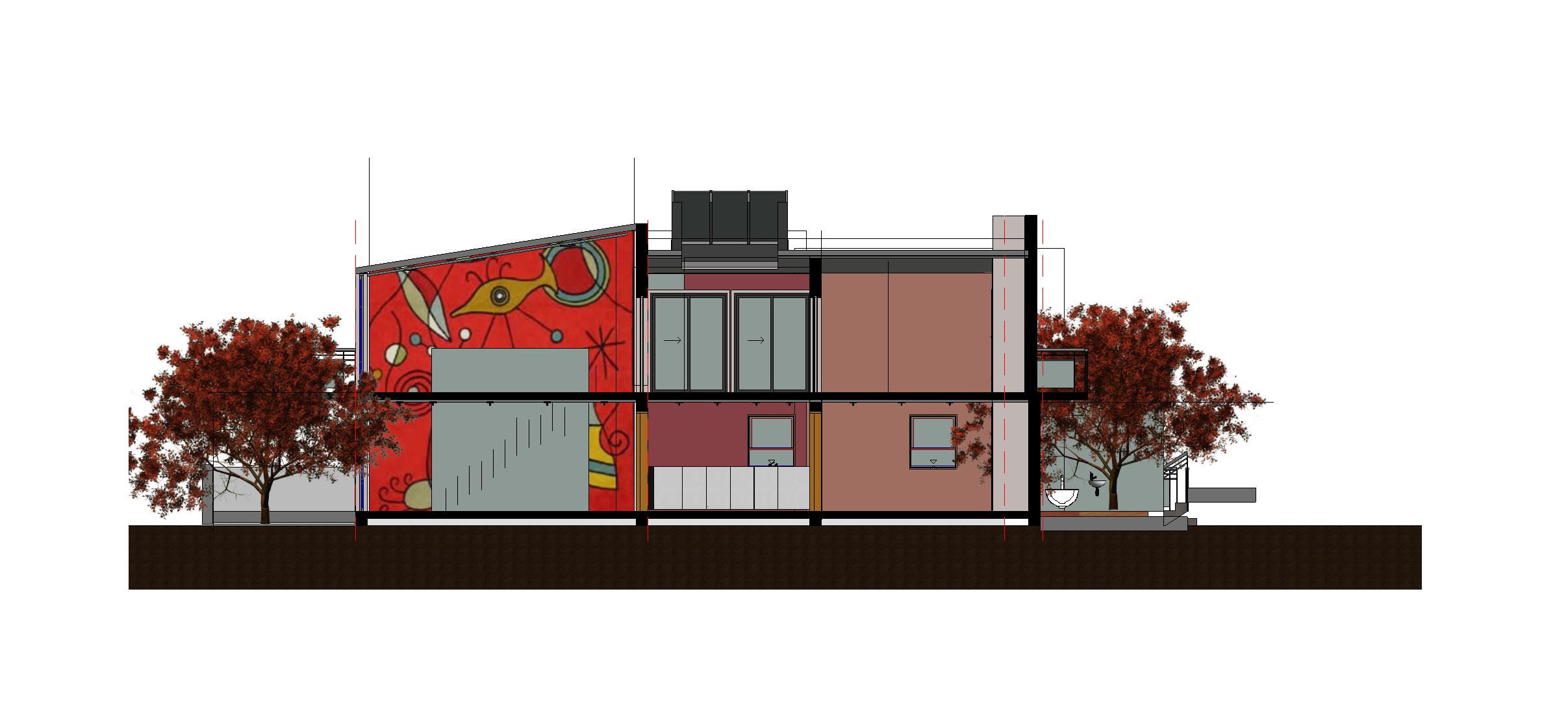 Warm colours are in the front of the home to warm the home where it is dark. Shades of red have been used in the kitchen to encourage eating. Indigo has been used in the back of the home to cool the home down and work tonally with the jacaranda lavender tree colour. This is also in keeping with the aboriginal heritage.