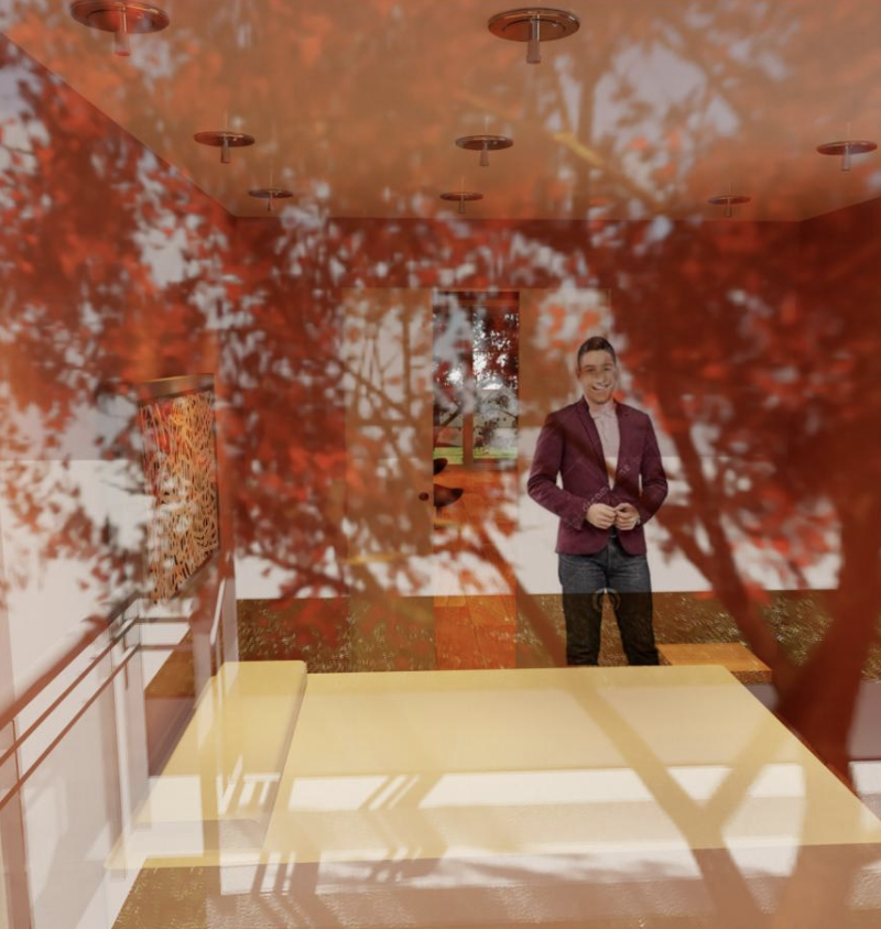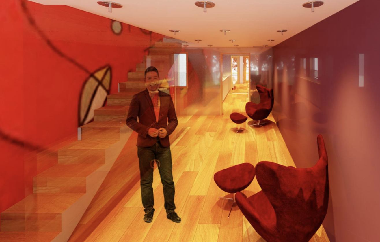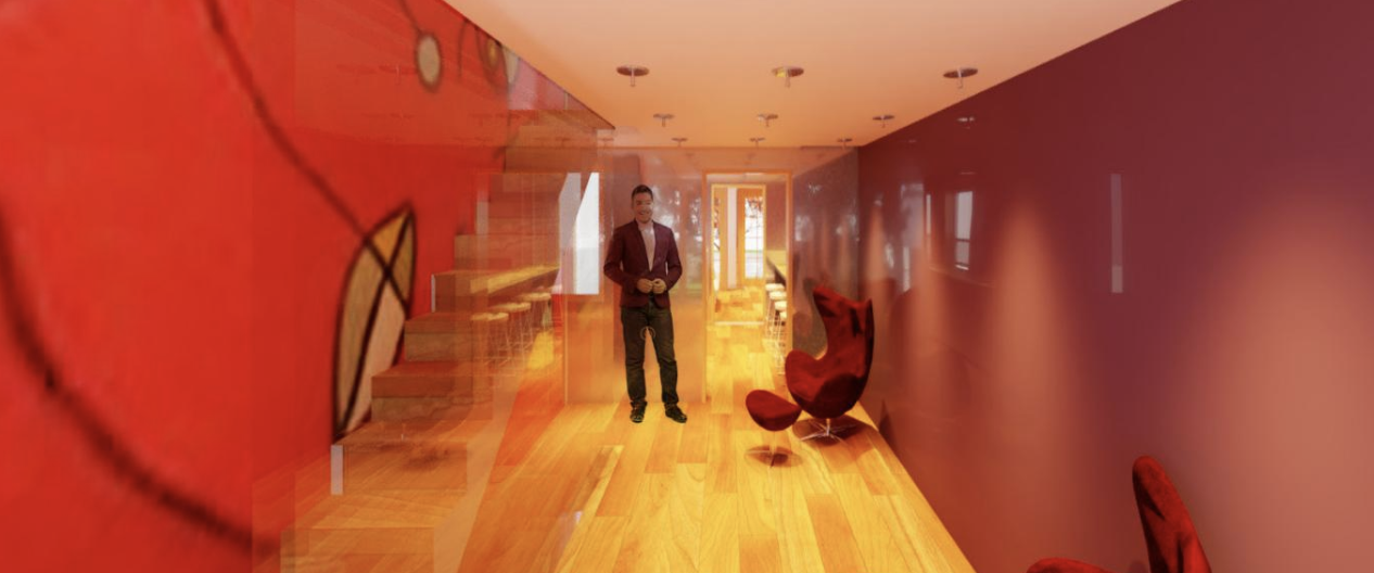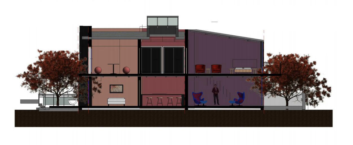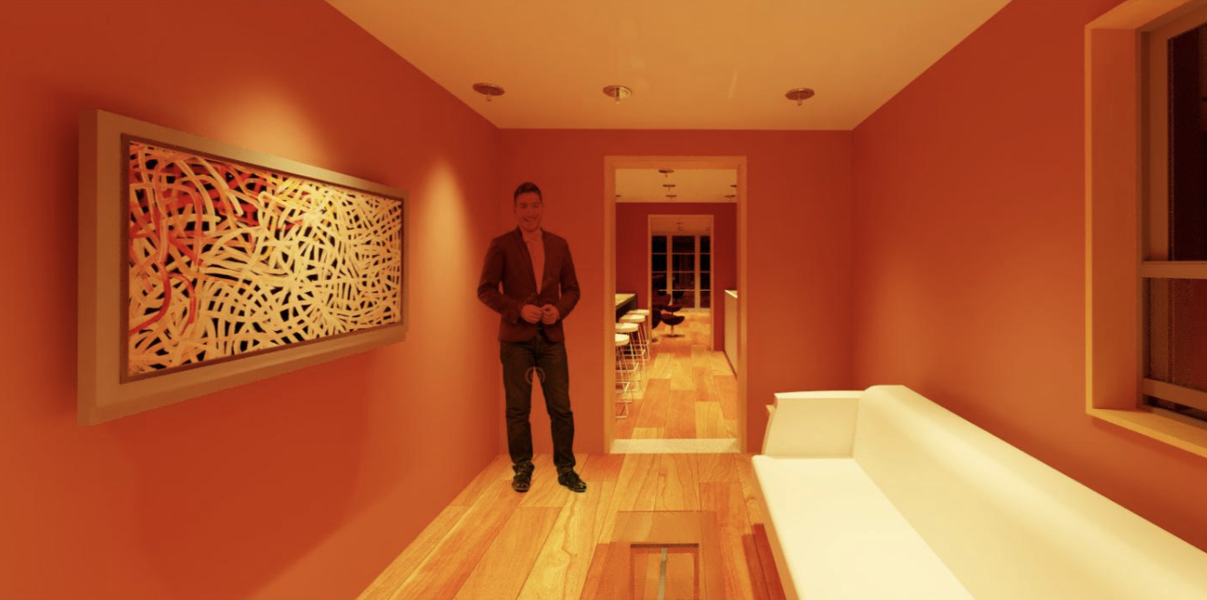 Warm colours are in the front of the home to warm the home where it is dark. Shades of red have been used in the kitchen to encourage eating. Indigo has been used in the back of the home to cool the home down and work tonally with the jacaranda lavender tree colour. This is also in keeping with the aboriginal heritage.